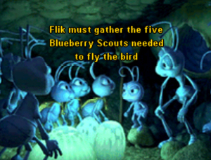 In der Intro-Sequenz siehst du diesmal, wie Flik bei den Blaubeeren-Pfadfinderinnen auftaucht. Er bittet sie, den Vogel zu starten, um Hopper und seine Spießgesellen in die Flucht zu schlagen.