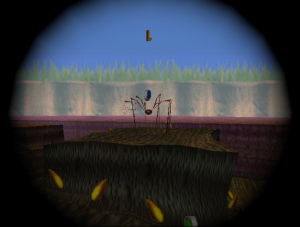 Geh nun zurück zur roten Kreuzung und schlage die entgegengesetzte Richtung ein. Hier lauern auf einem langen Weg gleich drei Wespen und ein fieser Ameisenlöwe. Aber es gibt zum Glück auch zwei Körner einzusammeln (8/50). Um den ersten Hügel herum lauern weitere Gegner, eine Wespe, eine Fliege und eine Zecke. Du findest eine Stelle, an der du nach oben klettern kannst. Auf dem kleinen Rundweg kannst du sage und schreibe neun Körner (17/50) und eine grüne Münze abgreifen. Oben bewacht die Spinne eine blaue Münze und ein leider noch zu hoch schwebendes L, das du von unten schon mit dem Fernrohr erspähen konntest.