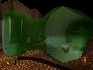 Gleich zu Beginn des Levels kannst du das an einer Spinne üben. Aber Achtung, das Biest kann dich auch in deiner vermeintlich sicheren Ecke treffen. Nimm das Korn mit (1/50) und schau durch das Fernglas um die Ecke. Hier wird dir das Versteck des Buchstabens K und das Ende des Levels offenbart. Außerdem kannst du gleich in der Nähe zwei weitere Körner einsammeln (3/50). (In der N64-Version gibt es auf der Straße keine Körner zu finden.) Töte die Spinne am Ende der Straße und nimm auch ihr Korn mit. (4/50). In der Ecke kannst du ein weiteres Korn (5/50) und eine erste grüne Münze ergattern. Geh nun zurück zum Anfang und um die Ecke. Bei der Sporenpflanze, die rote Sporen spuckt, kannst du eine Fliege töten und ihr Korn einsammeln (6/50). Weiter hinten geistert eine weitere Fliege herum, die sogar noch ein zusätzliches Korn bewacht (8/50). (Auch dieses zusätzliche Korn fehlt in der N64-Version.) Nimm hier auch die zweite grüne Münze mit. In einer weiteren Ecke liegt ein Korn (9/50) neben einer violetten Münze. Nutze diese, um aus irgendeinem der festgewachsenen Samen eine lila Pflanze zu züchten, die dir die Blaubeere bringt.