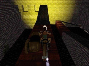 Folge dem Gang fahrend bis zu einer Rampe. Hier ist Speichern angesagt. Ziel ist es, den Raum zu durchqueren, ohne mit dem Motorrad ins Wasser zu stürzen. Die Taktik hier heißt „langsam fahren“. Arbeite mit der Bremse, um nicht vom Rand zu stürzen. Fahre also mit Bedacht auf die Rampe. Bald fährt oben rechts ein Block aus dem Wasser, den du als Brücke nutzen kannst. So geht das bis zum Ende der langen, nach oben führenden Strecke. Warte immer einen Augenblick, bis die Blöcke vollständig herausgefahren sind, bevor du darüber fährst. Ganz oben fährst du in einen nebligen Raum, in dem es erst einmal ein kleines Medipack zu holen gibt. Nun musst du mit dem Motorrad die letzte Rampe hoch und durch die Wand fahren, danach hat es erst einmal seine Schuldigkeit getan.