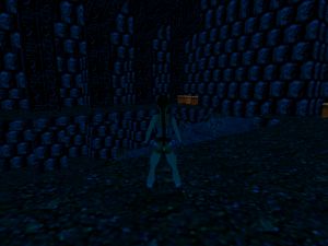 Laufe zügig weiter in den dunkelblauen Raum mit den transparenten Plattformen. Dadurch weckst du die ganzen elf Skelette aus den Nischen, also springe schnell weiter, zum Beispiel nach rechts. Dorthin scheinen die Gegner nicht zu kommen, sondern sie halten sich eher links vom Eingang auf. Du kannst sie ignorieren oder mit einer passenden Waffe besiegen bzw. in den Abgrund schubsen. Einer der Gegner hat 1 × Fackeln dabei. Ganz im Westen liegt auf einer kleinen Plattform ein Laser. Du gelangst diagonal mit Anlauf dorthin. Wenn du die Plattformen nach Osten hin überwindest, liegt dort 1 × Revolver Ammo. Am Ende gehst du die dunkle Treppe hinauf, wo du einen Sprunghebel betätigst. Dieser entfernt etwa in der Mitte des langen Flurs mit den Skeletten einen Block in einer Nische. Bevor du dorthin gehst, schaust du dich in der NO-Ecke des Raums um. Hier gibt es (kaum zu erkennen) stufenförmig angeordnete Blöcke, die nach unten führen. Vom untersten springst du schräg in die Nische, wobei du die Handlungstaste drückst. Damit entdeckst du Geheimnis 1, bestehend aus 1 × Armbrust Explosivammo, einem großen Medipack, 1 × Granatwerfer leichte Ammo und einem Granatwerfer. Begib dich wieder aus der Höhle und springe mit Anlauf schräg nach rechts auf den untersten Block der Stufen. Klettere ganz nach oben und gehe wieder in den langen Tunnel. Auf halbem Weg ist nun auf der Ostseite ein Gang offen.