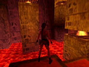 Und wieder musst du Lava überwinden. Du siehst mehrere Säulen, von denen einige in unterschiedlicher Höhe „unterbrochen“ sind. In diesen Lücken lodern Flammen. Einige andere Säulen lassen sich aber auch erklimmen. Wende dich zunächst nach rechts und gehe die Treppe hinunter. Am Ende kannst du dich rechts auf eine Säule hochziehen. Drehe dich in die entgegengesetzte Richtung und springe mit Anlauf zur nächsten Säule, die du geradeso erreichst. Wenn du dich hier nach links drehst, erkennst du leicht schräg eine weitere Säule, auf der du stehen kannst. Richte dich darauf aus und springe mit Anlauf und Festhalten hinüber. Mit einem einfachen Sprung kommst du dann bis zur Kante der Säule in der Ecke. Hier schaust du nach oben und erkennst einen Spalt auf der Nordseite. Springe von der höchsten Stelle hinauf und ziehe dich in den niedrigen Gang hoch (Kriechtaste drücken). Hinter der Biegung krabbelst du zum Hathorbildnis, das auf dem Gitter liegt. Kombiniere es im Rucksack mit dem Ornate Handle zum Portalwächter. Setze deinen Weg in linker Richtung fort, bis du abermals links in einen ägyptisch anmutenden Gang gelangst. Hier nimmst du die Leiter nach oben. Sobald du wieder stehen kannst, läufst du schnell links um die Ecke, denn eine weitere Harpyie ist auf dich aufmerksam geworden. Bleibe direkt im Winkel stehen und mach gehe am besten noch in die Hocke, dann erwischt sie dich nicht und du kannst sie in Ruhe mit den Pistolen erledigen. Sammle in diesem Bereich 1 × Uzi Ammo ein. Kehre noch einmal zur Leiter zurück. Wenn du nach links um die Ecke schaust, siehst du einen düsteren Gang. Richte dich diagonal darauf aus und laufe (!) hinüber (für einen Sprung hast du oben zu wenig Platz). In diesem Gang liegt ein kleines Medipack. Der Rückweg geht mit einem schrägen Sprung, weil der Tunnelausgang leicht schräg ist. Dort, wo die Harpyie herkam, betrittst du rückwärts die Rampe, um dich unten festzuhalten. So ist der anschließende Fall nach unten nicht ganz so schlimm und mit einer Rolle erleidest du kaum Schaden.