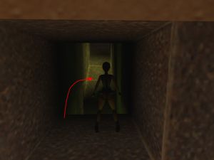 Im gesamten inneren Bereich ist es dunkel. Du wirst etliche Fackeln benötigen, um alle Gegenstände zu finden und Fallen auszuweichen. Der lange Gang führt um einige Ecken und dann nach oben. Irgendwann kommst du zu einer T-förmigen Abzweigung. Nimm erst einmal den rechten Weg. Er endet in einem großen Loch, in das du dich rückwärts hinunterfallen lässt. Hier liegen 1 × Fackeln, 2 × Gewehr Schrot Ammo und ein großes Medipack. Doch auch eine Mumie ist hier gefangen. Wenn du die Munition aus der NW-Ecke einsammelst, öffnet sich das Gitter. Klettere also rechtzeitig wieder nach oben und gehe durch den Gang zurück. An der Abzweigung ist die andere Richtung dran. Du gelangst in einen spärlich beleuchteten Raum mit mehreren Säulen.