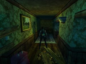 Im Raum mit dem Kamin gelangst du über die herunterhängende Decke in die nächste Etage. An der Wand mit den Fenstern befindet sich (unterhalb des Gemäldes) der Brief.