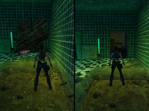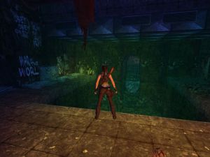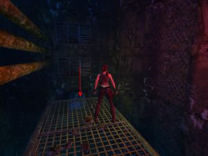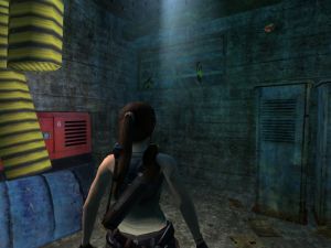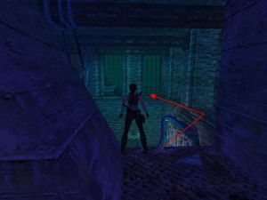 Obwohl sich der Geheimraum schon ganz am Anfang des Levels befindet, ist diese Tür zunächst geschlossen. Du bekommst sie erst im Laufe des Spiels mittels einer Maschine auf. Du kommst wieder an der Tür vorbei, nachdem du die Kanalisation verlassen hast. Nun ist sie offen.