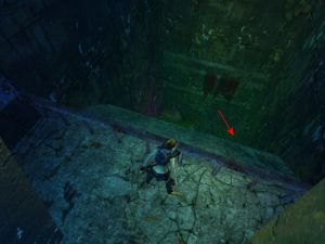 Nachdem du dich im Dorf mit mehreren Plünderern herumschlagen musstest, gehst du durch das Tor, aus dem sie kamen. Du musst über das Geländer ins Wasser springen, wo du durch einen Spalt zum Geheimnis tauchen kannst.