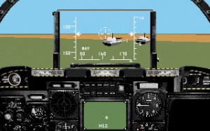 Es folgt eine etwas schwerere Aufgabe. Drehe deine Maschine um 180° und fliege nach Norden zu dem Konvoi von 4 nachgebauten T-80-Panzern (7). Halte dich hier beim Anflug etwas höher. Wenn du die Zielmarkierung siehst, musst du auf die Entfernungsanzeige achten. Bis du an die 3.000-Meilen-Grenze heran, musst du deine Maschine so herunterziehen, dass das Fadenkreuz mitten im Zielcursor steht. Feuere jetzt einen kurzen Stoß aus deiner Bordkanone ab (mit der Leertaste) und die Panzer sollten vor deinen Augen explodieren. Vergiss vor Freude nicht, die Maschine wieder hochzuziehen, bevor du abstürzt.<br> | Es folgt eine etwas schwerere Aufgabe. Drehe deine Maschine um 180° und fliege nach Norden zu dem Konvoi von 4 nachgebauten T-80-Panzern (7). Halte dich hier beim Anflug etwas höher. Wenn du die Zielmarkierung siehst, musst du auf die Entfernungsanzeige achten. Bis du an die 3.000-Meilen-Grenze heran, musst du deine Maschine so herunterziehen, dass das Fadenkreuz mitten im Zielcursor steht. Feuere jetzt einen kurzen Stoß aus deiner Bordkanone ab (mit der Leertaste) und die Panzer sollten vor deinen Augen explodieren. Vergiss vor Freude nicht, die Maschine wieder hochzuziehen, bevor du abstürzt.<br /> | ||