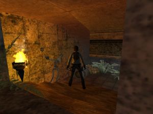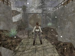 Folge dem bekannten Weg durchs Wasser und ganz am Ende nach oben. Es geht nach links durch den Raum mit der Stromfalle, im Raum mit dem Kamin nach links und im SW-Gang nach unten in den Raum mit dem großen verschlossenen Tor. Klettere in die Öffnung gegenüber, wo es nun über eine Leiter nach unten geht. Der Sprung zur Leiter ist nicht ganz einfach. Gehe ganz an die linke Kante und drehe dich nach rechts, bis du die rechte Kante der Leiter anvisierst. Unten drehst du dich um und folgst dem Gang, der vor dem Gitter rechts abbiegt. Betätige den Hebel und vergiss nicht das große Medipack in der breiten Nische. Begib dich zurück, wobei du die Leiter etwas umständlich über mehrere Nischen erreichst. Verlasse die Leiter nach rechts und springe zurück in den Raum mit den Tierstatuen. Nun geht es nach draußen.